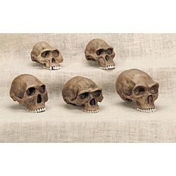 Réplicas individuales de cráneos originales de las siguientes zonas: Africana, Asiática, Europea, Indonesia, entre los que se encuentran: Australopithecus Boisei Australopithecus Afarensis Australopithecus Crassidens Australopithecus Africanus Neanderthal, Cro-Magnon Homo Erectus Rhodesian Sinanthropus Steinheim Homo Habilis Homo Sapiens Pithecanthropus. |