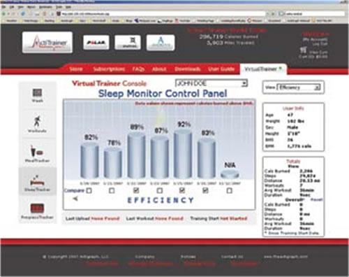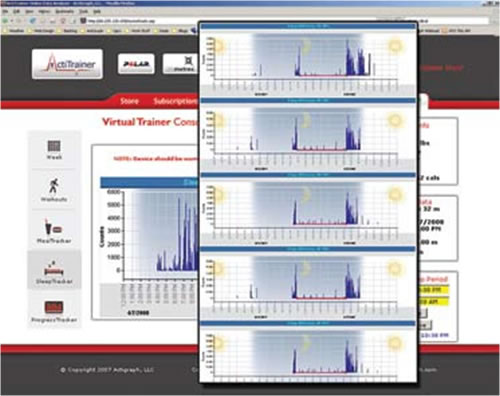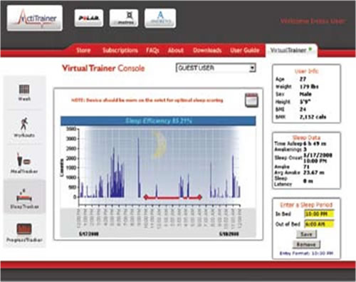 El Virtual Trainer SleepTraker es un software que usa el Algoritmo de Sadeth para realizar puntuaciones de sueño en datos de actividad nocturna recogidos por Actigraph. Medidas SleepTracker: -Cantidad total de Sueño. -Número de veces que despertamos. -Duración del tiempo despierto. -Latencia del Sueño. -Eficiencia del Sueño. Características de SleepTracker: -Cumple HIPPAA -Permite comparar hasta 10 sesiones de sueño con gráficos. -Comparación por tramos o totales. -Comparación con valores normales. -Indicadores BMI y BMP por paciente. -Posibilidad de monitorizar múltiples pacientes simultáneamente. -Actualizaciones Automáticas. -Posibilidad de ampliación a Virtual Trainer Program que permite evaluar actividad diurna, calorías y objetivos de actividad. |